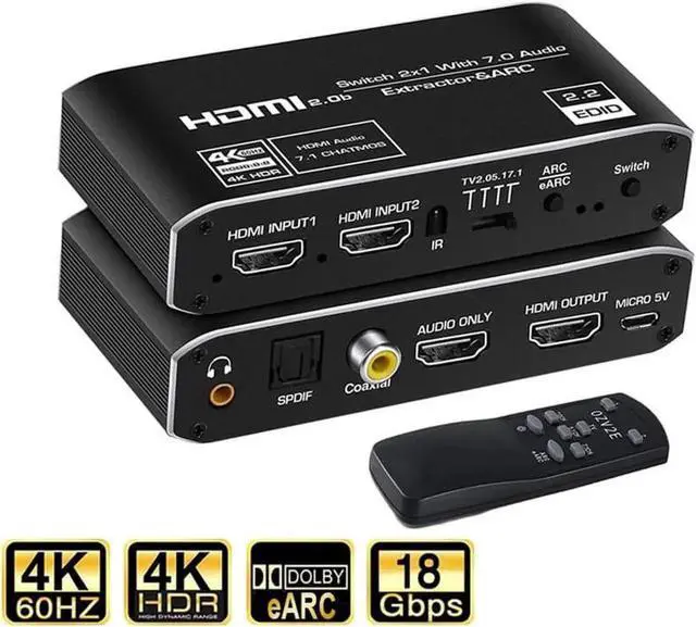 2x1 HDMI Switch With Audio Extractor: 4K HDMI 2.0 Audio Extractor at high performance. It has 2 HDMI Input and 1 HDMI output with audio Extract Function. Support ARC and eARC Function. The Extract Audio can be output by 3.5mm Audio Jack, Toslink SPDIF, Coaxial, HDMI Audio Port. It allows user to use the existing audio Receiver to receive 4Kx2K@60Hz, HDCP 2.3 content audio. The product also supports HDMI loop out, as well as 10bits HDR(High Dynamic Range).