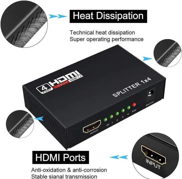 1x4 hdmi splitter with 1 input ports and 4 output ports, can distribute one signal source to 4 hdmi displays or 4 separate HDT