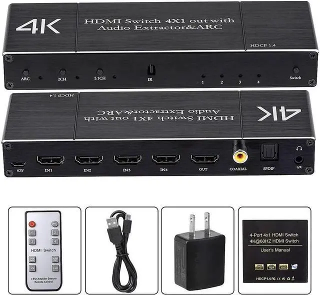 4K HDMI Switch 60Hz HDMI Switcher 4 Port 4x1 HDMI Switcher Splitter Box hdmi Audio Extractor Supports ARC HDR10 ARC 18Gbps HDCP2.2,RGB 8:8:8,3D with Remote Control, OZQ7