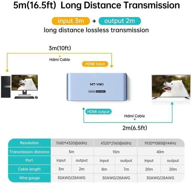 Cascade Connection: This 8K HDMI splitter 1x4 supports cascade, one to multiple, Signal source transmission support up to 26ft (Input 16 ft and output 10ft ).