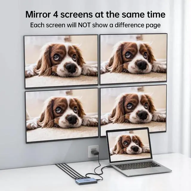 This 8K HDMI splitter 1 in 4 out can mirror/duplicate one HDMI source on four 8K monitors simultaneously @8K 60Hz or 4K 120Hz.