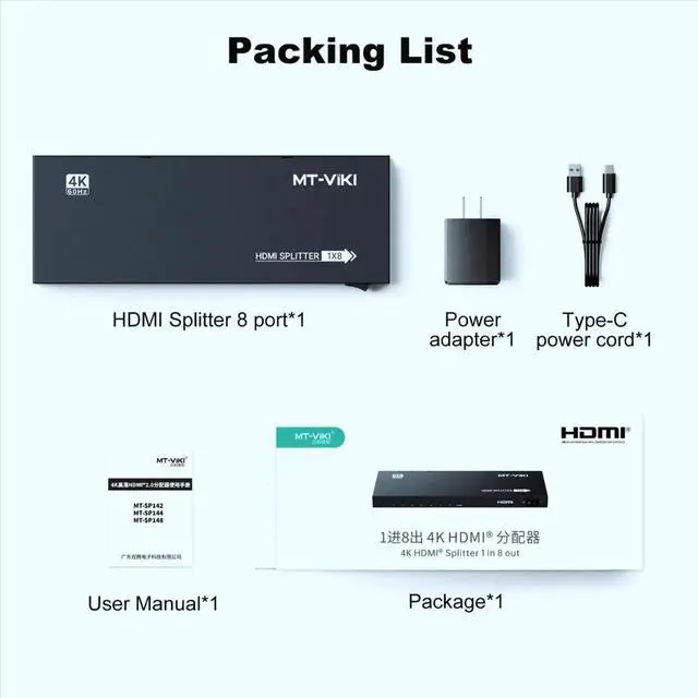 Package: 4K@60Hz HDMI Splitter 1 in 8 out *1, AC Power adapter*1; MT-VIKI also provide 4K/8K HDMI splitter 1 in 2 out, 1 in 4 out, 1 in 8 out, and 1 in 16 out