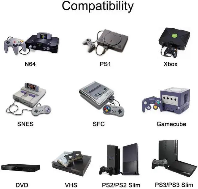 2.Compatible with Sega, WII,SFC, N64, NGC, SNES, PS1, PS2, PS3, Xbox, STB, VHS, VCR DVD Players, TV and Projector, etc.