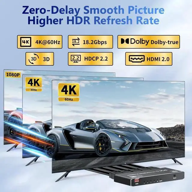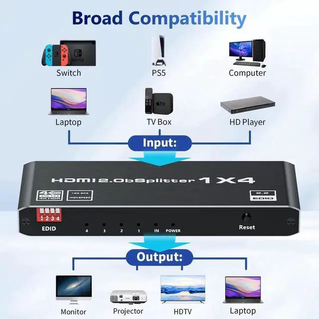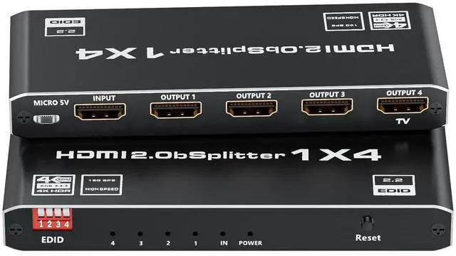 Vszerda 4K@60Hz HDMI splitter 1 in 4 out supports mirror mode (showing same content on four outputs ). It does not support display different content to the four output monitors