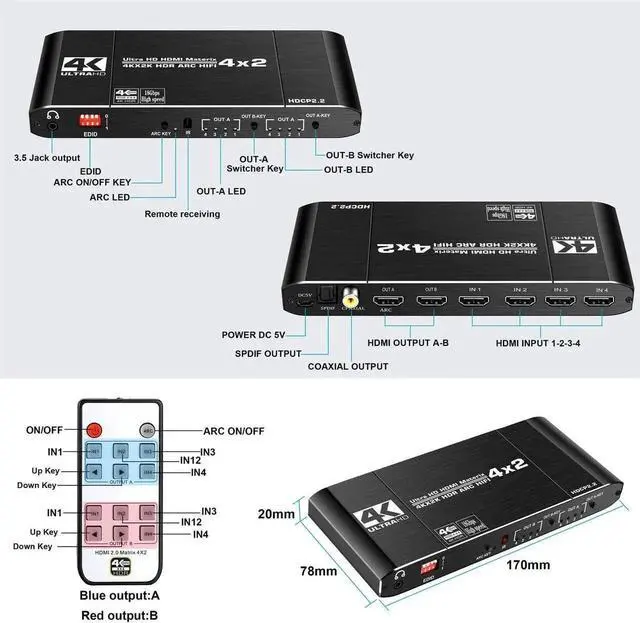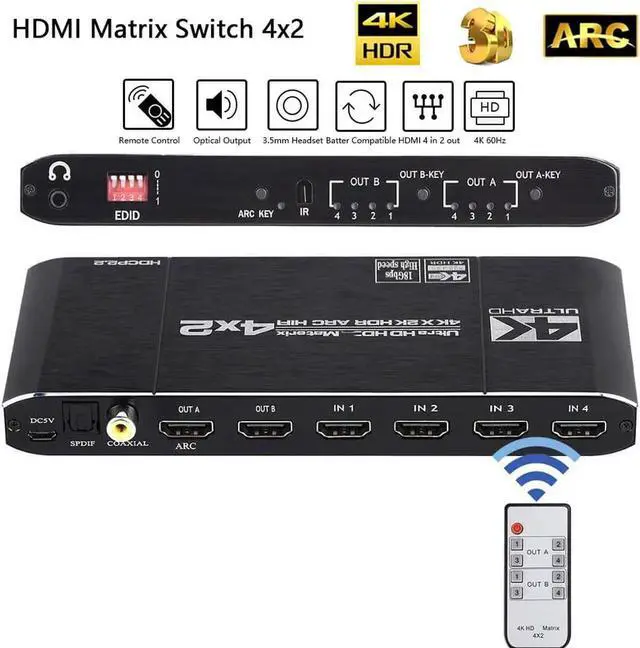 HDMI Matrix Switch Splitter 4X2, HDMI Switcher with EDID Extractor and Remote Control