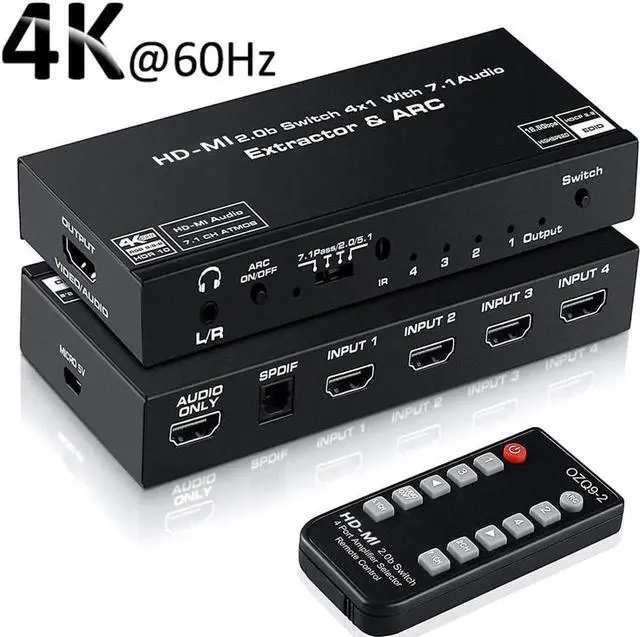 • 4K HDMI 2.0 Audio Extractor is a high performance 4 HDMI input and 1 HD-MI output switch with 1 HDMI audio out .HDMI /Toslink/3.5mm jack audio output support audio extract function , HDMI AUDIO ONLY /Toslink SPDIF support ARC (Audio Return Control ).The system supports all 3D TV formats in addition to all HDTV formats up to 4Kx2K@60Hz RGB 8 :8 :8 .
