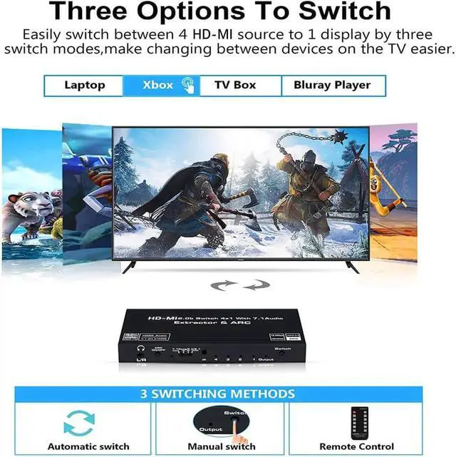 4 IN 1 OUT HDMI AUDIO SWITCH: HDMI switch 4-port distributes up to four HDMI input source to one HD Display, solving your multiple HDMI devices issue. Simultaneously, Via HDMI (7.1CH audio)/optical/3.5mm port add external speakers, amplifiers, sound bar, receiver to your film/game system with ease. (Not 1 In 4 Out HDMI Splitter)