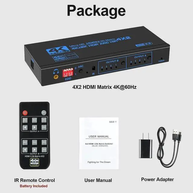 - What You Get: 1 x 4K@60Hz HDMI Matrix 4 in 2 out, 1 x IR Remote Control, 1 x 5V/A Power Adapter, 1 x User Manual.