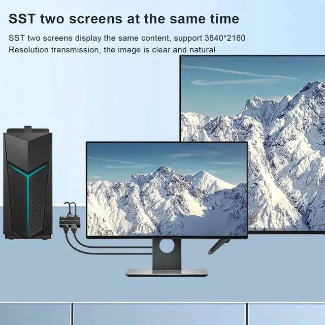 The Dual Port DisplayPort 1.4 MST Hub splits a DisplayPort 1.4 single output source into 2 Displays(HDMI+Displayport). It connects 2 monitors to the DisplayPort output with MST capability on your computer. Ideal for digital signage in schools, churches, conference rooms, trade shows, hotels and retail outlets, this hub allows you to display the same image on both monitors, extend the desktop across them.