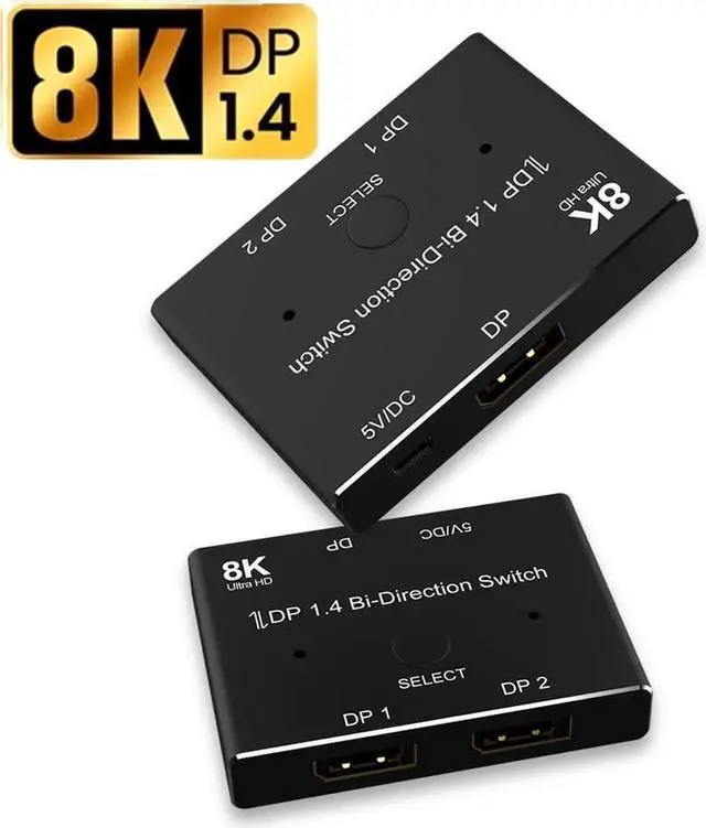 Vszerda DisplayPort 1.4 Splitter Switch 8K, DP 1.4 Switcher 2 in 1 Out 8K@60Hz DP Splitter 1 in 2 Out 4K@120Hz 2K@144Hz Bi-Directional for Multiple Source and Displays