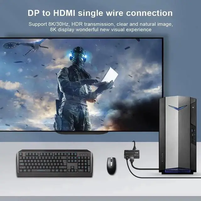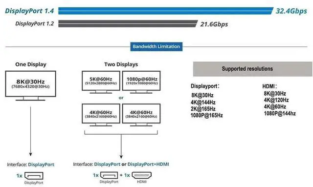 DATA Information: 1): Single dp to dp support 8k@30hz, 4k@60/144hz, 2k@165hz. 2): Single dp to hdmi support 8k@30hz, 4k@60/122hz, 2k@144hz. 3): dp to dp+hdmi support dual 4k@60hz or 5k@60hz + 1080p@60hz.(CHECK 7th picture for a reference)