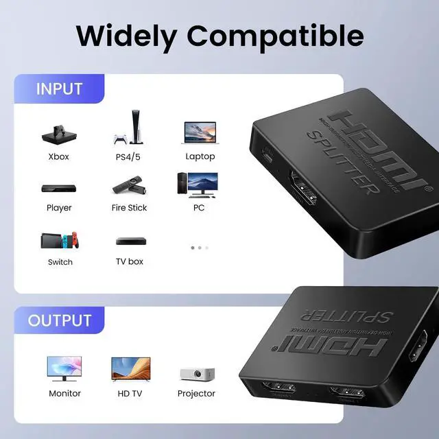 This 3 way HDMI splitter allows one HDMI input source to three HDMI monitors, distributes video and audio simultaneously without any loss.