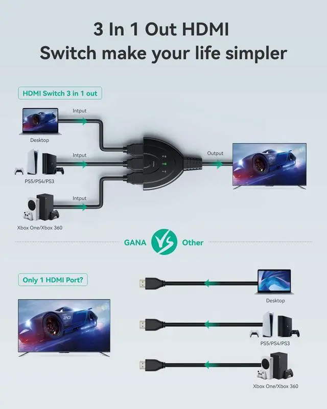 HDMI Switch 3 in 1 Out Upgraded HDMI splitter can transfer 3 HDMI Port into to 1 HDMI screen compatible for various HDMI devices, perfect for Xbox 360 One, PS4 PS3, Blu-ray player, DVD player, Roku Stick, computer etc.