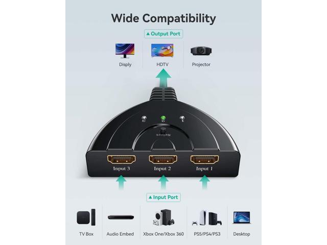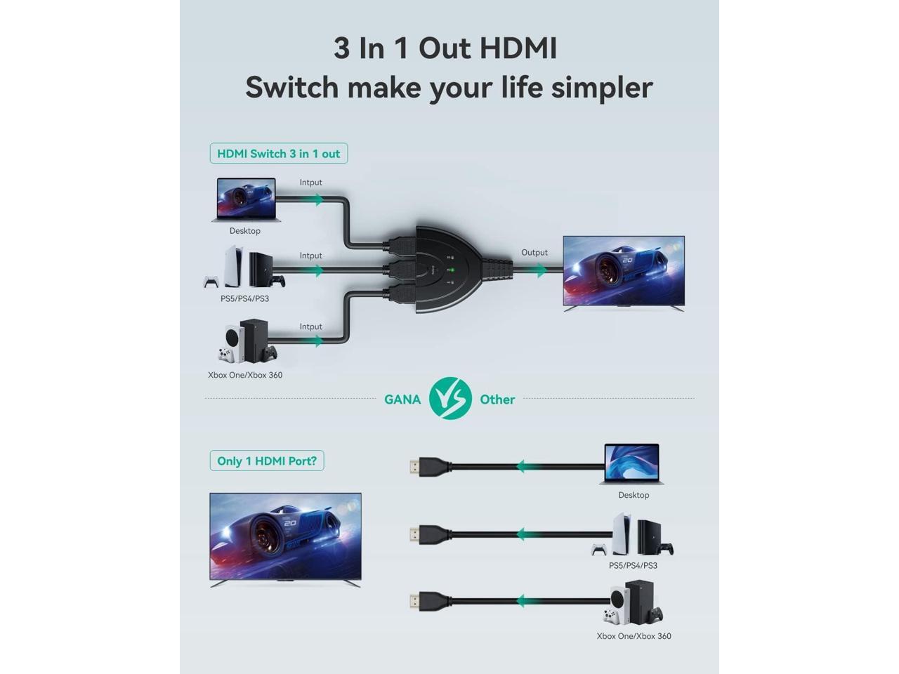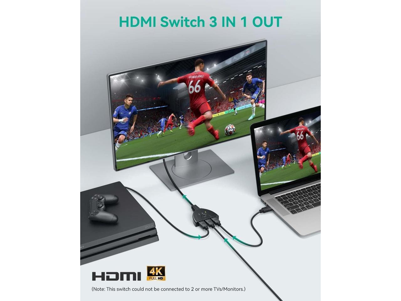 - HDMI Switch 3 in 1 Out Upgraded HDMI splitter can transfer 3 HDMI Port into to 1 HDMI screen compatible for various HDMI devices, perfect for Xbox 360 One, PS4 PS3, Blu-ray player, DVD player, Roku Stick, computer etc. Note: IT DOESN'T DISPLAY MULTIPLE SCREENS AT A TIME, only show 3 sources and 1 screen at same time.