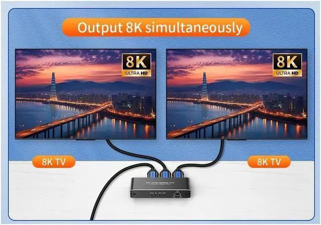 Out: This 8K HDMI Splitter 1x2 allow to connect One HDMI source devices to Two HD TV/HD monitor or projector by HDMI Cable.