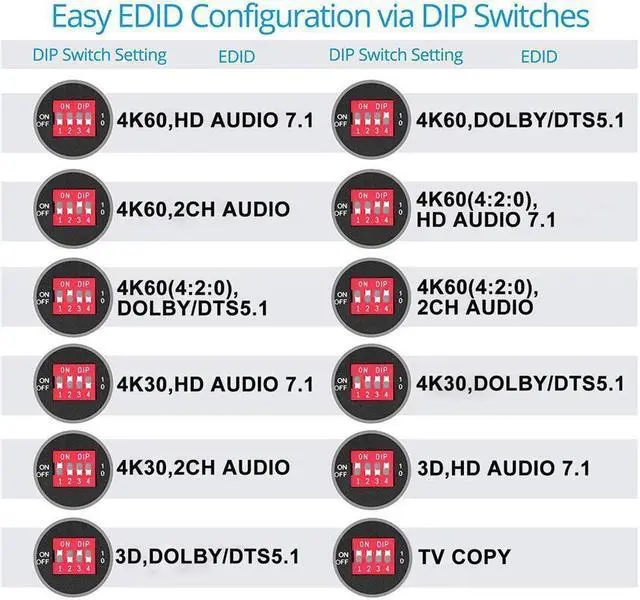 Supports high resolutions up to 4K×2K @60Hz including 480i, 480p, 576i, 576p, 720p, 1080i, 1080p, 2160p.