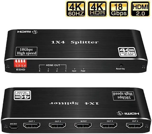 1x4 HDMI 2.0 b Splitter uses a single HDMI source, accessing to multiple HDMI sinks. It allows one HDMI device to be split easily to 4 HDMI compatible monitors or projectors. In additionit can be placed at the end of a long HDMI cable to regenerate the HDMI signal. The resolution of this hdmi splitter can be up to 4Kx2K@60Hz.