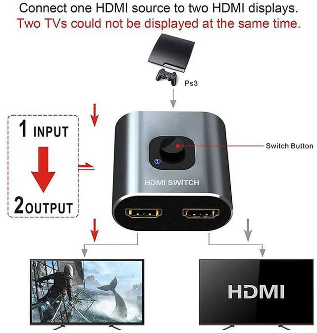 Two-Way HDMI SwitcherThis HDMI switcher provides 3 HDMI ports, so you can connect two HDMI sources to one HDMI display, or connect one HDMI source to switch between two monitors, with 2 LED indicators, you can easily know which port is active LED light (one of the 2 monitors works at the same time)