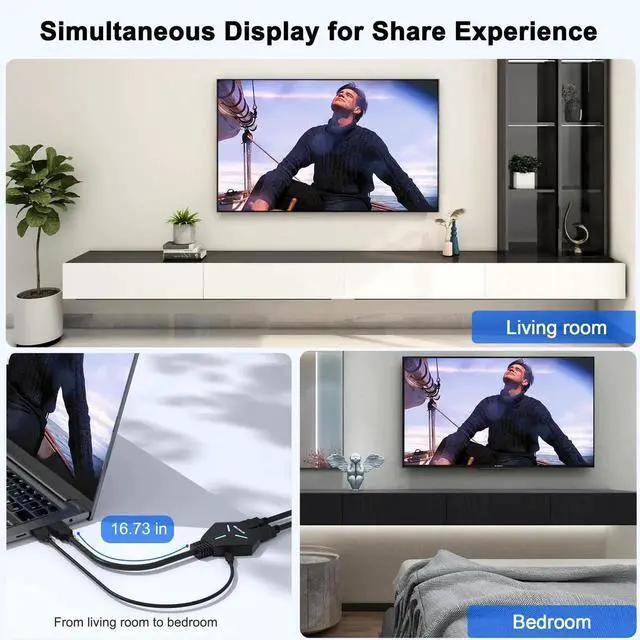 Additional Features- [Dual Monitor Hdmi Splitter]Compatible with most HDMI sources, the dual HDMI adapter distributes one HDMI signal to two HDMI devices so you can enjoy the same picture with family and friends in two different rooms at the same time without having to change rooms. Standard HDMI cables up to 10 meters are recommended. (Note: If the overlong between the splitter and screen, please use the additional power cord included with the product to provide additional power to the product to improve picture quality and transmission distance.