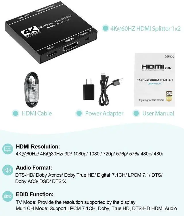 4K@60Hz HDMI Splitter 1 in 2 Out, 4K HDMI Splitter for Soundbar and TV, 1x2 Hdmi Splitters Adapter Support Audio and Video Output Sync Up, 3D, 18.5Gbps, HDR, EDID, HDCP2.3