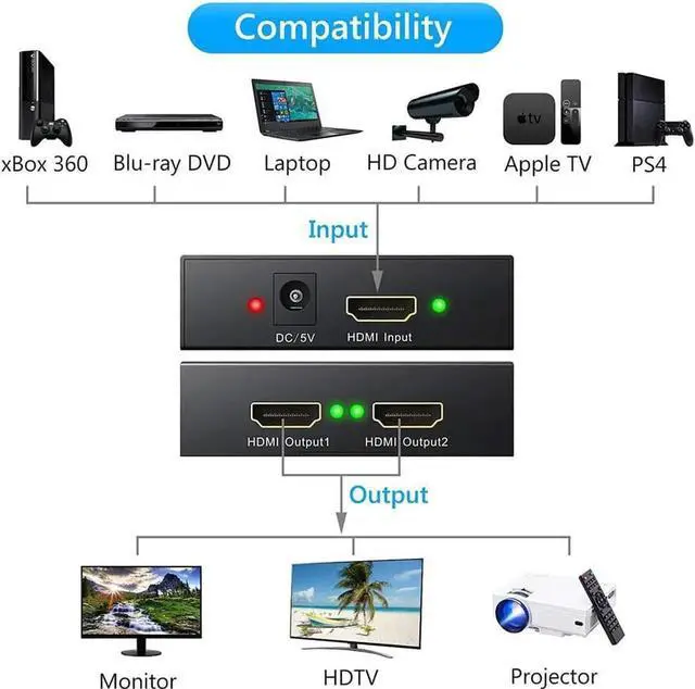 Splits 1 HDMI Input Source to 2 HDMI Signals, Output to 2 Separate HDMI Displays or HDTVs Simultaneously. Distributes Audio and Video Signal to 2 HD Monitors Simultaneously. Powered by DC 5V 1A Power Supply (Included).