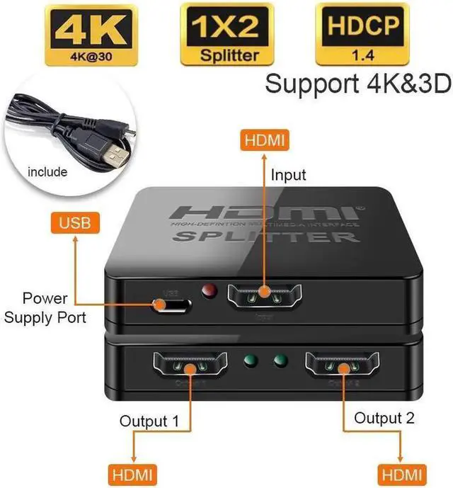 1x2 HDMI Splitter 1 Port to 2 HDMI Display Duplicate/Mirror - Splitter Ver 1.3 Certified for Full HD 1080P High Resolution & 3D Support (One Input To Two Outputs) - Power Cable Included