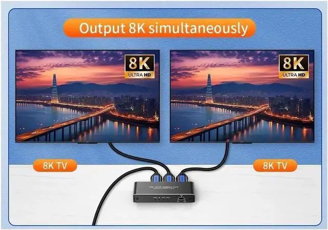 8K HDMI Splitter: HDMI Splitter Support Ultra HD 8K @60Hz/4K@120Hz / 3D / Full-HD 1080P resolution. Support HDCP 2.3, Dolby Vision, (For 8K@60Hz/4K@120Hz you need to use Real 8K HDMI 48 Gbps AWG26 standard cable).