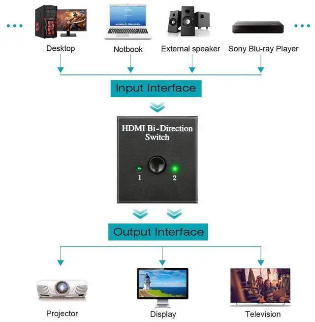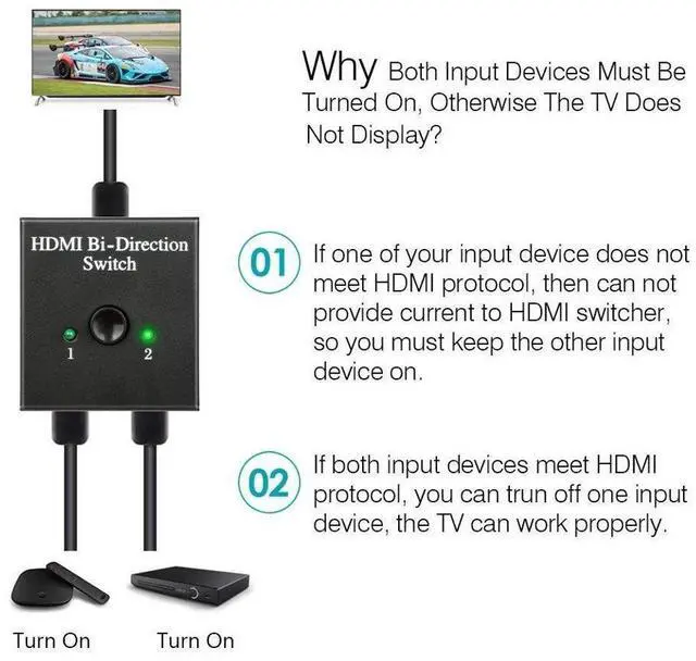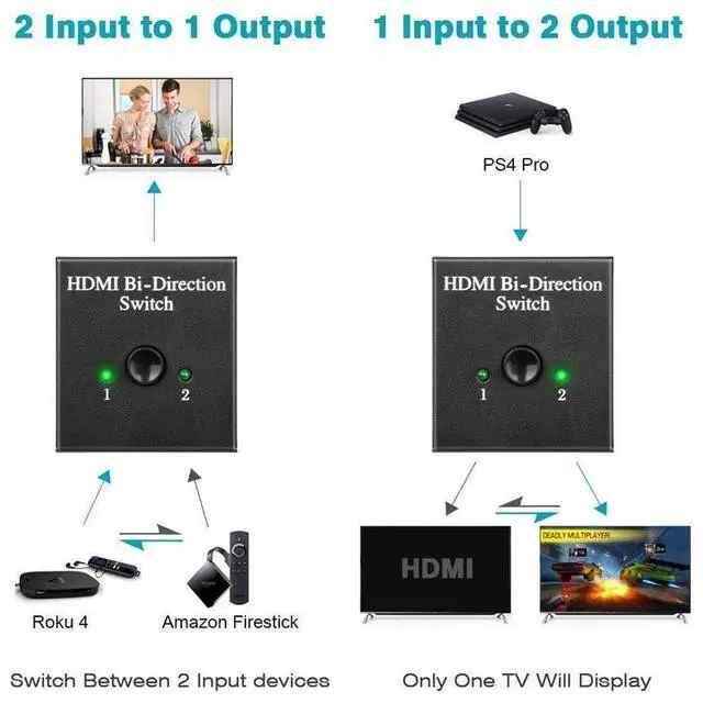 Output: Connect 1 HDMI source to 2 displays, toggle between 2 display devices. (only one output device will display for each time) hdmi spliiter 4k Compatibility Devices hdmi 1080p splitter hdmi a b switch supports