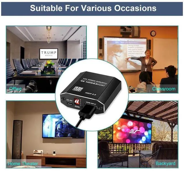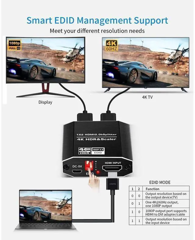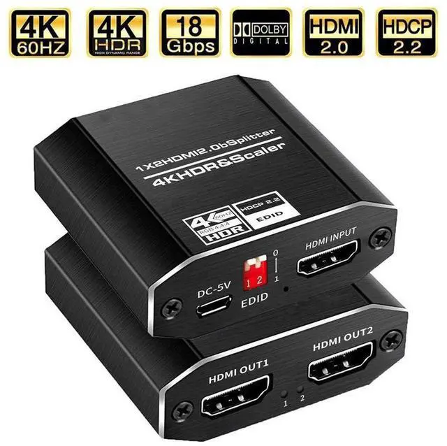 4K HDMI splitter supports different resolutions display up to 4k, including 3D, Full HD 1080P, 4K@60hz, 4k HDR & Scaler. Support EDID mode.