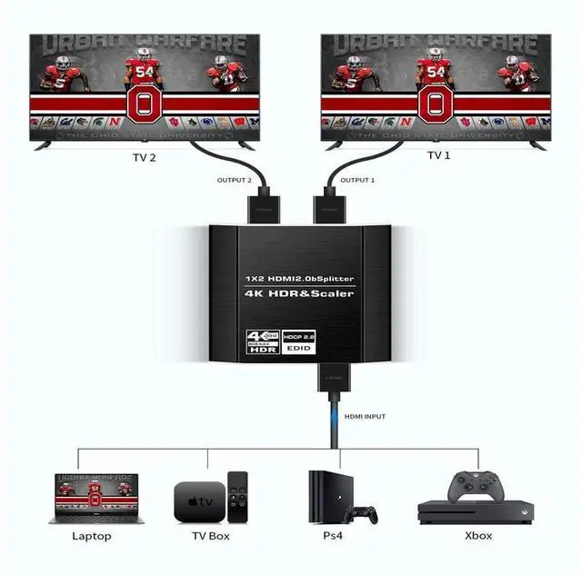 Using the latest HDMI splitter chip, this 4k HDMI splitter 1 in 2 out is compatible with most devices with standard HDMI interface, inlcuding: Apple TV, XBox, PS3, PS4, PS4 Pro, Fire TV Stick, Blu-Ray DVD player etc