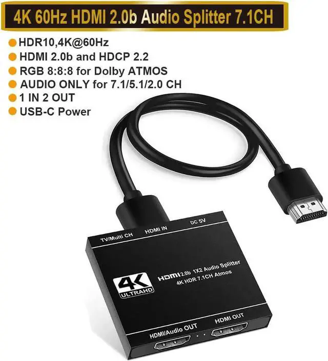 - Support HDMI Audio Device: The 2th HDMI output port of this 4K power HDMI splitter 1X2 can support connect HDMI audio device! Just connect one HDMI input source, one HDMI audio output device and HDMI monitor output, then you can enjoy the feel of home theater! Audio format: DTS-HD, Doby Atmos, Doby True HD, Digital 7.1CH, LPCM 7.1, DTS, Doby AC3, DSD, DTS:X. When you connect HDMI audio device, please dial the EDID on to "Multi CH" mode. (Don't connect with the HDMI ARC port of the soundbar)