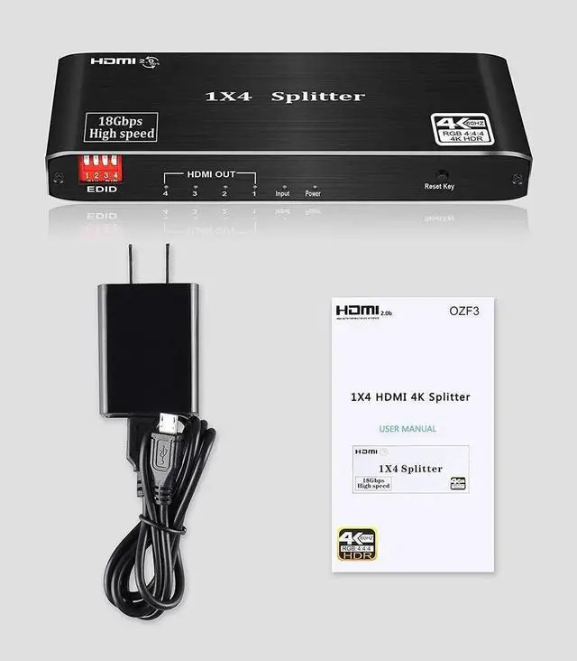 1x4 HDMI Splitter, 4K 60Hz 1 in 4 Out HDMI Splitter Audio Video Distributor Box Support Full Ultra HD, 3D, HDR, Compatible for HDTV, Blu-Ray, DVD, Xbox, PS4 Etc