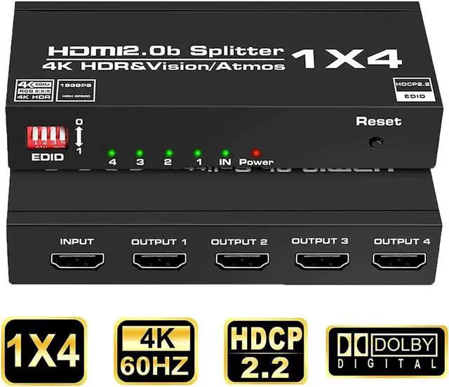 HDMI SPLITTER 1 in 4 out: The 4K 1x4 hdmi splitter supports One input device duplicate to 4 output displays. The highest configuration expands to 4 HDMI output port, Meet your more display requirements on different occasions.