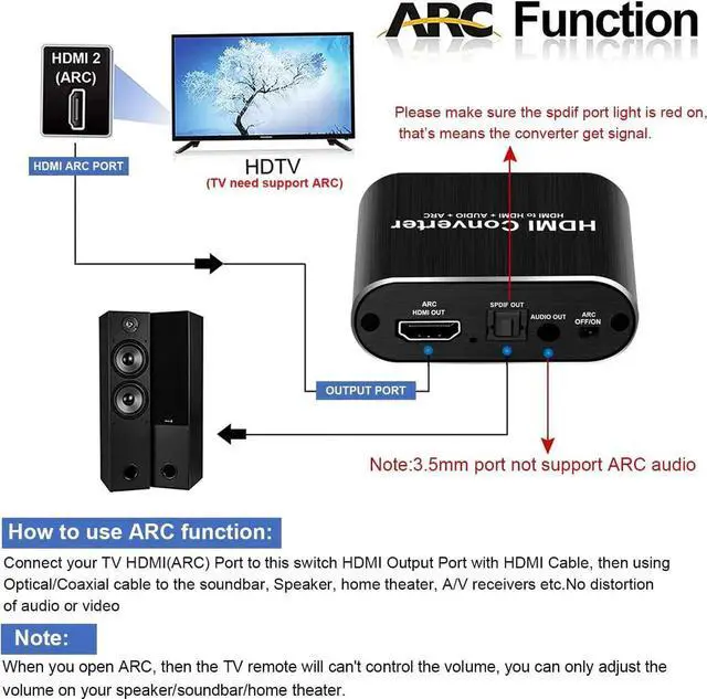 1: This full HD supports 3D, 4K x 2K, ARC HDCN0020M1 audio splitter, can connect HDMI-Compatible signal source to a single HDMI-Compatible display device(such as TV, projector) and independent output stereo + SPDIF signal, to achieve HDMI-Compatible signal audio synchronization separation, and support ARC audio backhaul function.
