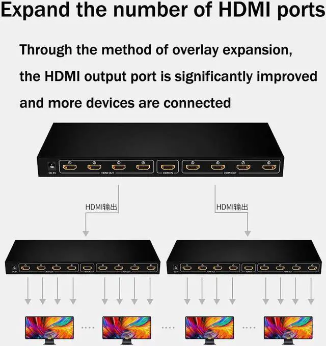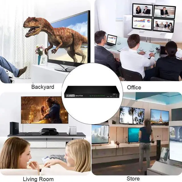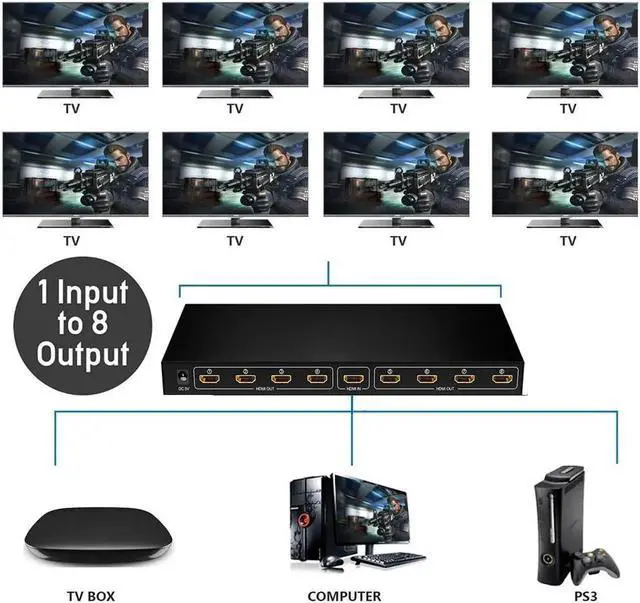HDMI Splitter amplifies and distributes the HDMI input signal into eight identical, synchronized outputs. The splitter also has the ability of buffering and amplifying to achieve longer transmission distance of HDMI signal. Compatible with HDTVs, projectors, PC monitors, as well as various HDMI source devices including PC, cable/satellite receiver, Blu-ray DVD player, PS 3/4, Xbox, Chromecast, Amazon Fire TV etc., this splitter is suitable for home theater and other dual display applications such as data center control, information distribution, conference room presentation, school and corporate training environment.