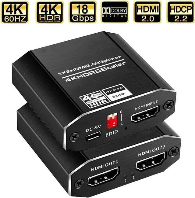 4K HDMI splitter supports different resolutions display up to 4k, including 3D, Full HD 1080P, 4K@60hz, 4k HDR & Scaler. Support EDID mode.