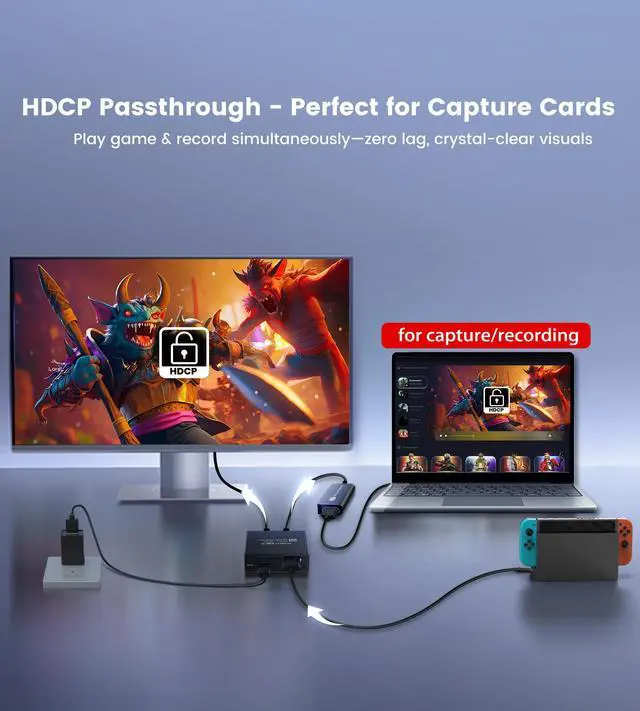 2 Out 4K is a professional powered HDMI splitter that duplicates one HDMI source to two HDMI displays at the same time, delivering stable, lag-free, and lossless transmission. It supports 4K & 1080P simultaneous display with advanced downscaler EDID management, making it the ideal HDMI splitter for TV, monitor, or projector setups. With support for resolutions up to 4K@60Hz, 2K@75/120/144Hz, and 1080P@60/120/240Hz, this HDMI splitter 120Hz ensures smooth video playback for movies, sports, and high-frame-rate gaming. It is also compatible with ultra-wide formats like 3440×1440@60Hz, providing a flexible solution for work and entertainment. For best results, use HDMI 2.0 cables (16.4ft for 4K, 32.8ft for 1080P).hdmi splitter with c port charger The built-in Down Scaler EDID offers three modes. Mix Mode (recommended) enables 4K and 1080P output at the same time, ensuring each display shows the optimal resolution. Copy A/B modes allow both displays to follow one outputs EDID while the other port automatically downscales if needed. This makes it one of the best HDMI splitters for setups that mix 4K TVs and 1080P monitors. As an HDMI splitter with audio output, it supports connecting a TV/projector and a soundbar or AV receiver via HDMI IN (not ARC/eARC). This allows it to work like an HDMI audio extractor splitter, delivering video and synchronized audio for immersive home theater with Dolby Vision and Atmos. Whether you want a laptop HDMI splitter for two monitors, a TV HDMI splitter, or a monitor splitter HDMI for PC gaming, this device offers versatile applications. The splitter is plug & play, requiring no drivers or complicated setup. With its included 4ft HDMI 2.0 cable, Type-C power cable, and 5V/1A adapter, it ensures reliable powered operation. Compact and durable, it works as an active HDMI splitter, HDMI Y splitter, or HDMI mirror splitter depending on your needs. HDMI passthrough to soundbar - Audio pass through, each of the hdmi output port can be connected to soundbar directly. HDMI splitter gammingConnect the PlayStation 5 / PS4 or other game consoles to this hdmi splitters HDMI in port, and connect splitter's hdmi outputs to 4K TV and soundbar, then you can enjoy 4K video and dolby 7.1ch sound while gaming; Perfect for home theater, gaming consoles, laptops, conference rooms, and multimedia teaching, this 1x2 HDMI splitter is a reliable choice for anyone needing a splitter HDMI 1 in 2 out 4K solution.