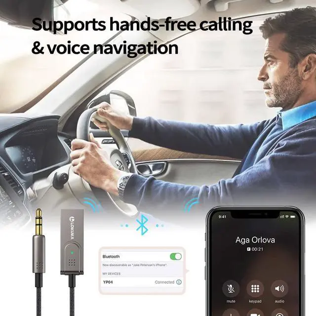 - Connect the USB port to power the Bluetooth, 3.5mm plug to car AUX IN port. It supports voice navigation, hands-free calls, or enjoy music on your jurney.