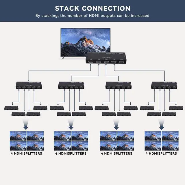 • Seamless 4k multi-monitor setup: This 1x4 hdmi splitter effortlessly mirrors or duplicates one high-definition hdmi source to four displays simultaneously. Perfect as an hdmi splitter for dual monitors, triple monitors, or a quad-screen setup for presentations, gaming, or digital signage.
