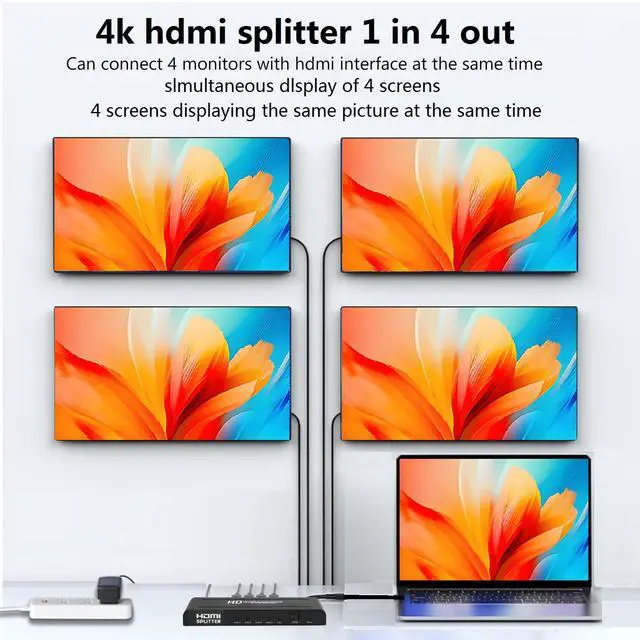 3.This 4 output hdmi splitter,Plug and Play,no delay, no flicker, no resolution degradation; no external driver required.