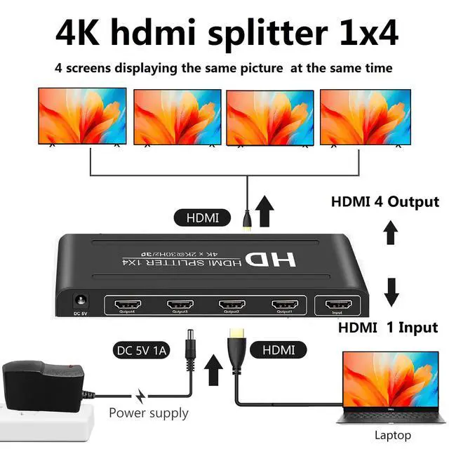 This HDMI Splitter 1 in 4 out -4 port hdmi splitter-4 Output hdmi Splitter- 4 way hdmi splitter-Powered hdmi Splitter supports Blu-ray players and various brands of players and OTT boxescompatible with TV, PS3, PS4, , Projector, Laptop , Computer, Gaming Console etc; It provides solutions for TV stores, digital entertainment centers, offices, hotels, HDTV retail and display venues, game room and data center control, information distribution, conference room presentations and corporate training environments, home theaters, and more.