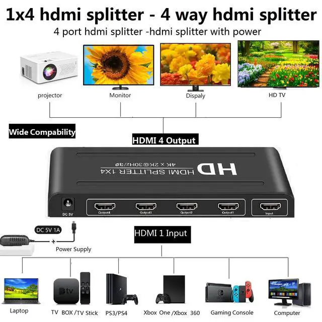 1. This 4kx2k hdmi splitter 1x4 have One Input Port: Compatible for computer, XBox 360, XBox one, PS3, PS4, Fire Stick, Blu-Ray DVD player, Satellite Receiver, Route Roku, Chromecast, PC, Laptop,Gaming etc.