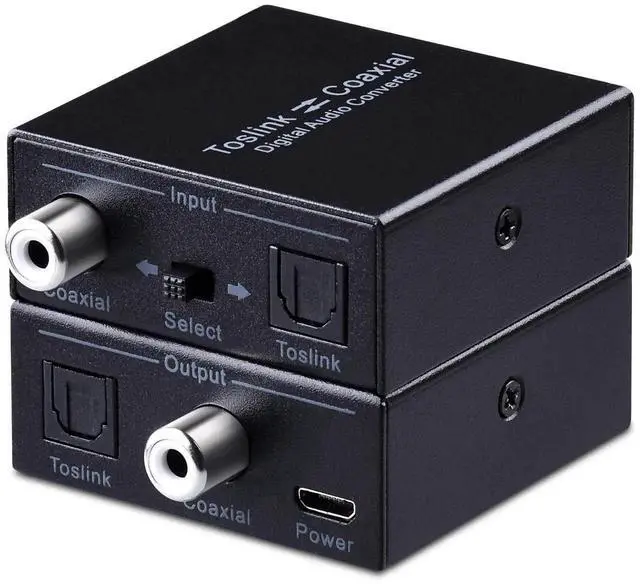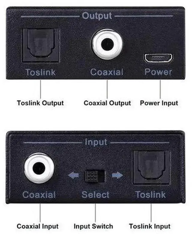 Optical To Coaxial Bi-Directional Audio Converter - Switch to select either Optical Toslink or Coax input and convert the signal (as is) to both its Coaxial and Optical Toslink output ports