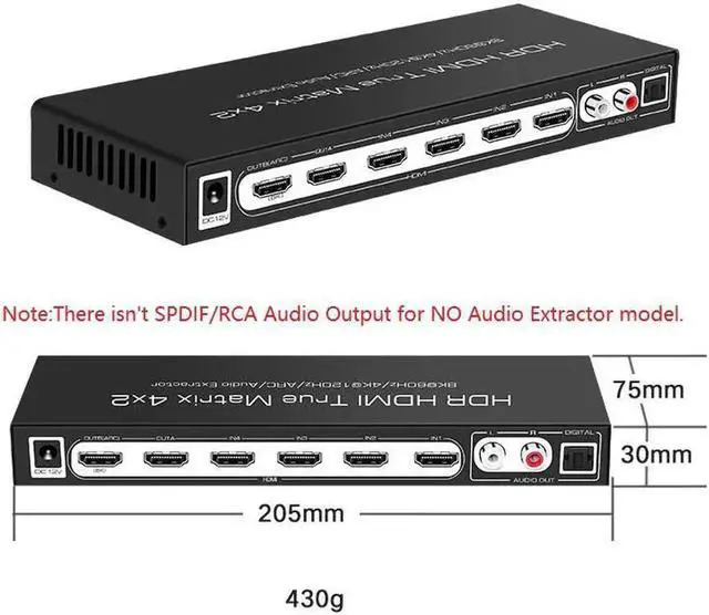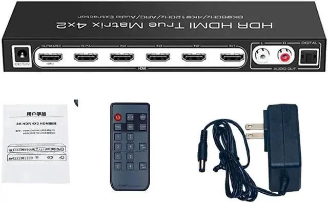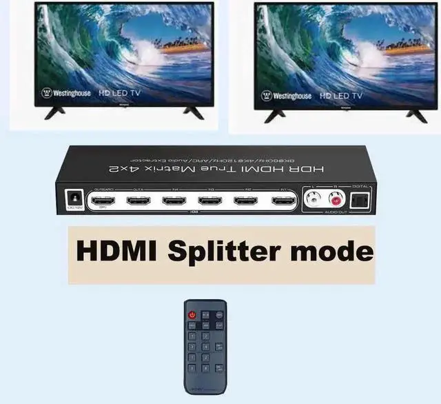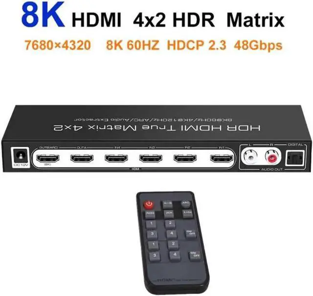 8K HDR HDMI True Matrix switcher switching any one of the four HDMI inputs to either one of the two outputs easily by remote control or buttons on the product panel