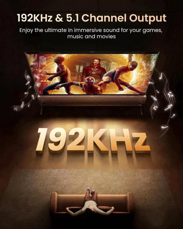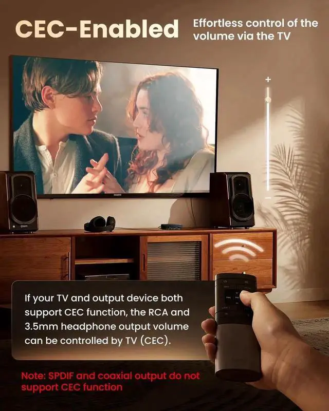 - [192KHz Lossless Audio Sampling Rate]: This HDMI ARC to RCA audio converter supports sampling rate at 32, 44.1, 48, 96 and 192 KHz. Supports 5.1 channel surround sound, including Dolby 5.1 and DTS 5.1. Only 3.5mm and L/R output can be controlled by the TV remote supports CEC.(Note: The Optical/coaxial outputs cannot be controlled by the TV remote, please adjust the speaker volume manually.)