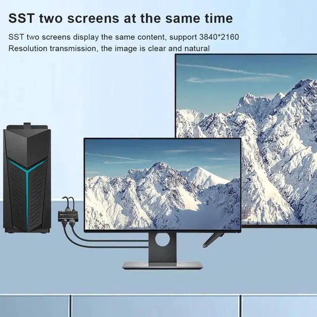 DisplayPort 8K Splitter,Using this DP splitter, two screens can be displayed at the same time. In SST mode, the two external screens display the same content, and in MST mode, the two external screens display different content.Please pay attention to select copy (SST) or extended mode (MST) on your computer.Due to system limitations, Mac OS's MST mode can only extend One screen