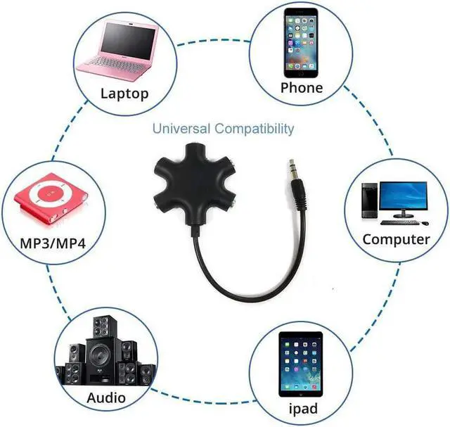 SHARE MUSIC - Share up to 5 audio outputs at the same time; with the AUX Headphone splitter allow to share music movies games with kids or friends The only thing better than listening to your favorite song or watching your favorite show or movie is sharing the experience with your friends and family. Just plug in any mobile device with music or movies on it -- such as your iPad phone or tablet -- connect up to five headphones and start sharing. It works with an auxiliary port. COMPATIABLE - Support any audio player or devices with 3.5 mm connectors 3.5 mm headphone adapter splits line into five 3.5 mm ports.