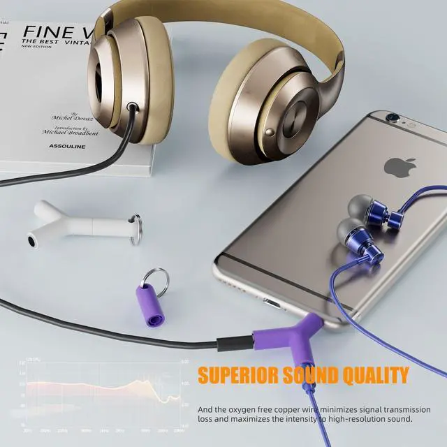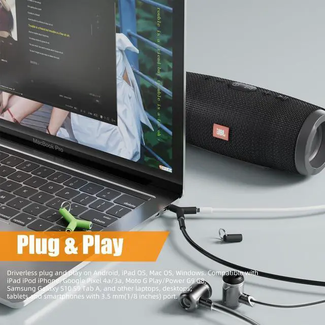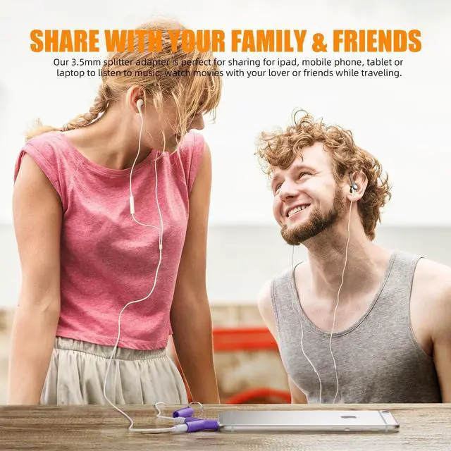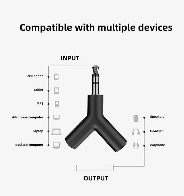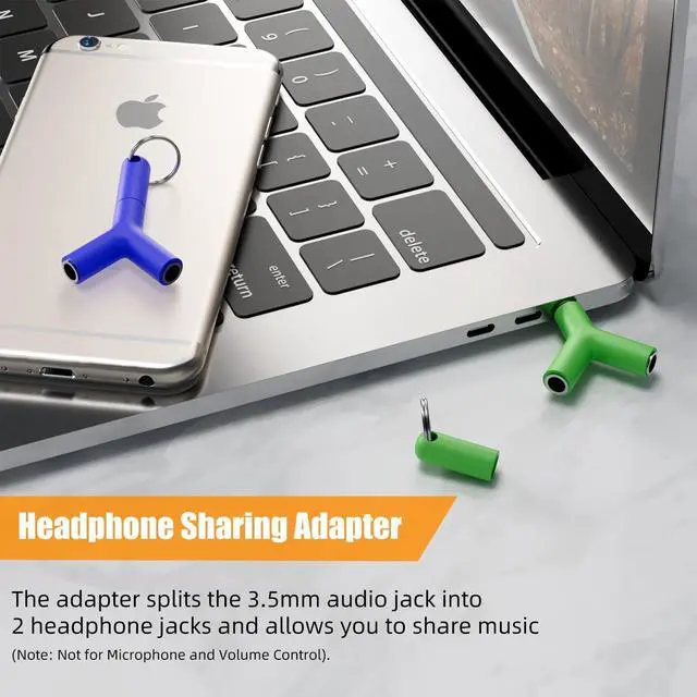 Headphone Sharing AdapterThe adapter splits the 3.5 mm audio jack into 2 headphone jacks and allows you to share music movies or games with your friend by connecting 2 pairs of headphones without disturbing others e. g. when traveling by an airplane. Superior Sound QualityConstructed with high-quality materials this Y-shaped 3.5 mm stereo splitter ensures clear and uninterrupted audio transmission delivering exceptional sound quality to both connected devices. Compatibility Headphone Splitter Adapter Devices with any standard 3.5 mm jack ports.