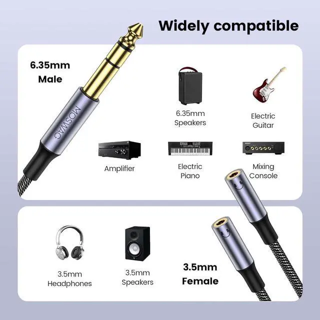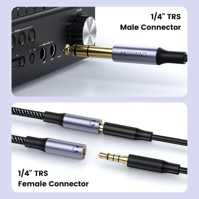 Its durable metal housing offers wear and corrosion resistance. Enjoy wide compatibility and a secure connection for uninterrupted music enjoyment. [Premium Manufacture Craft]Immerse yourself in rich nuanced audio with the MOSWAG 1/4 inch to dual 3.5 mm splitter. Built with tinned coppers robust aluminum foil shielding and a durable PVC jacket it provides high-density protection and exceptional isolation for a full delicate sound with remarkable fidelity. Enjoy a seamless audio experience thanks to its portable design quick response and secure conversion of 6.35 mm ports to dual 3.5 mm outputs. [Free-Worry Buy] Please connect us if you have any question no matter after or before buying.