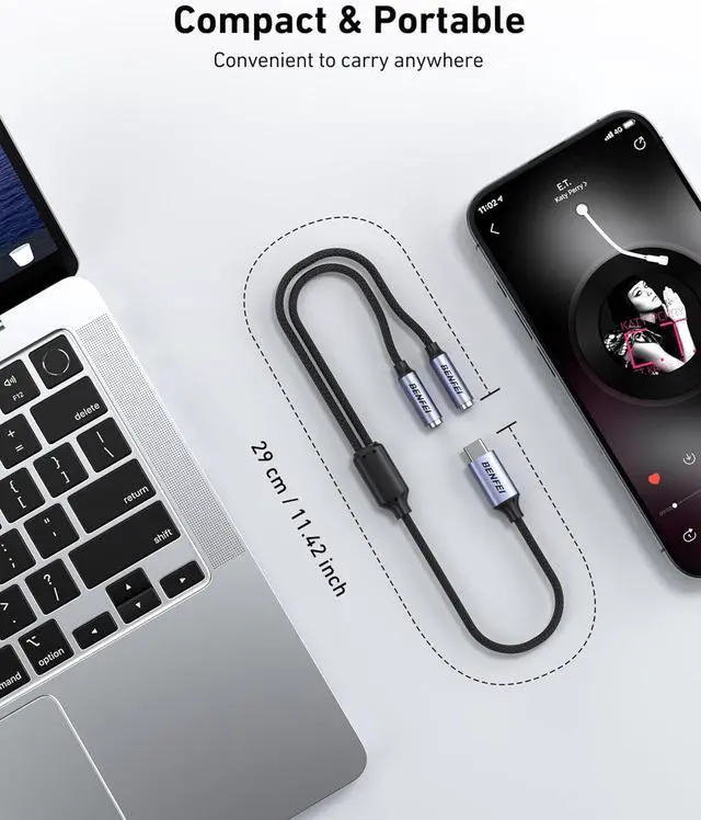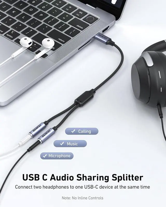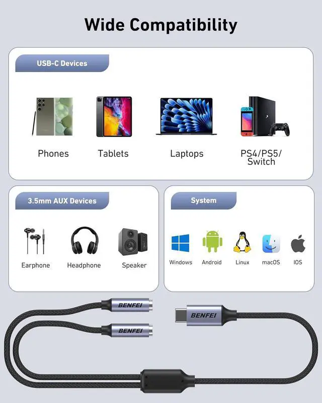 Share Audio Instantly with 2 PeopleBENFEI USB-C to dual 3.5 mm audio splitter allows you and a friend to connect two sets of headphones or speakers simultaneously. Perfect for enjoying movies music podcasts or online courses together on flights in dorm rooms or during a cozy night in. Immersive & Crystal Clear Sound QualityEquipped with an advanced built-in chip this adapter ensures high-fidelity audio transmission. Experience powerful bass smooth mids and crisp highs without any loss in detail. It provides a truly immersive listening experience making every moment shared more vivid and enjoyable. Extensive Device CompatibilityConfidently connect to a wide range of modern devices.